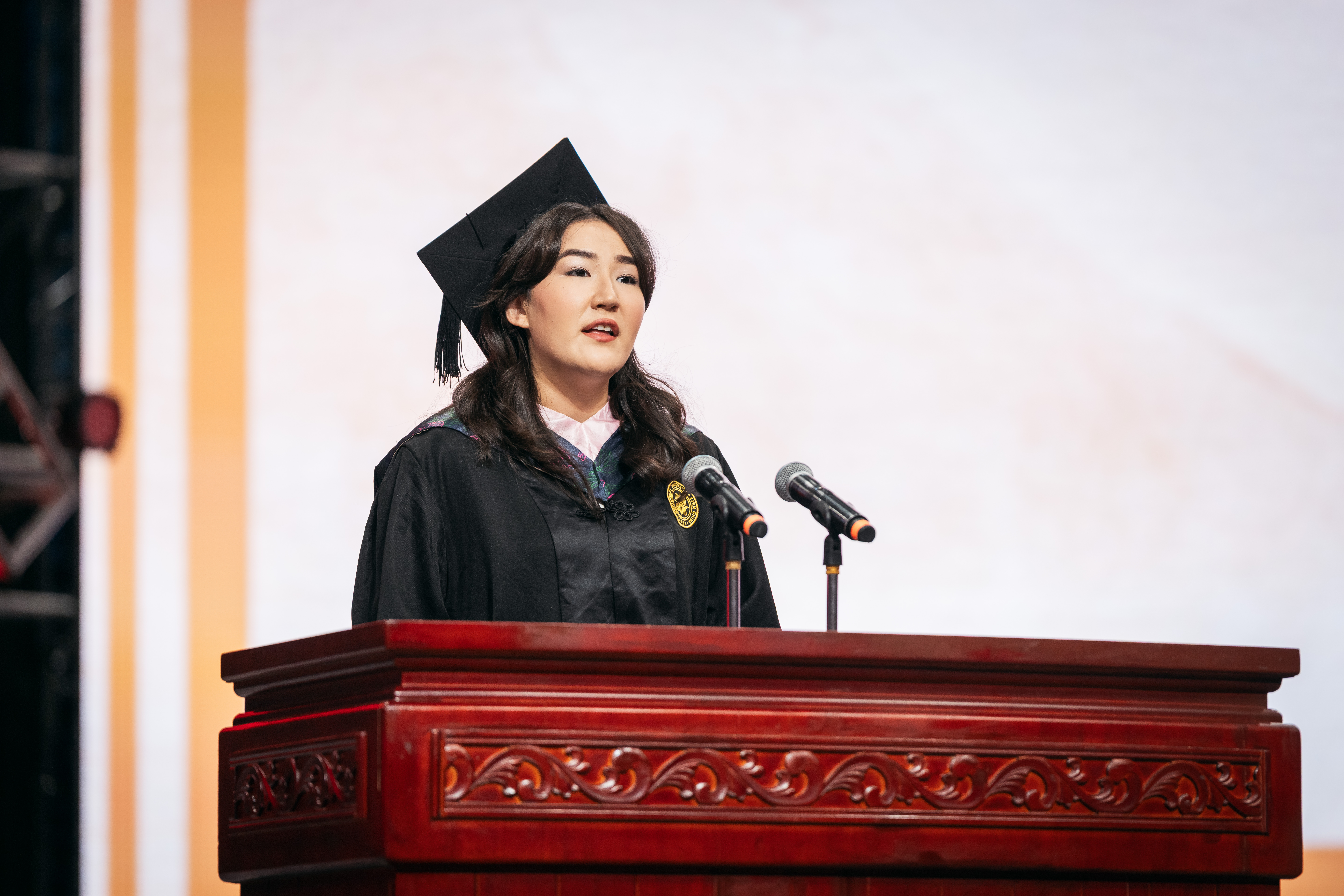 我是来自哈萨克斯坦的艾小情。今天,能够作为国际学生毕业生代表发言,我感到很荣幸。回望四年求学之路,我的内心充满了感激与感动。此刻,我愿用最真挚的感情,向母校、向师长、向朋友,致以我最深的敬意与感谢。