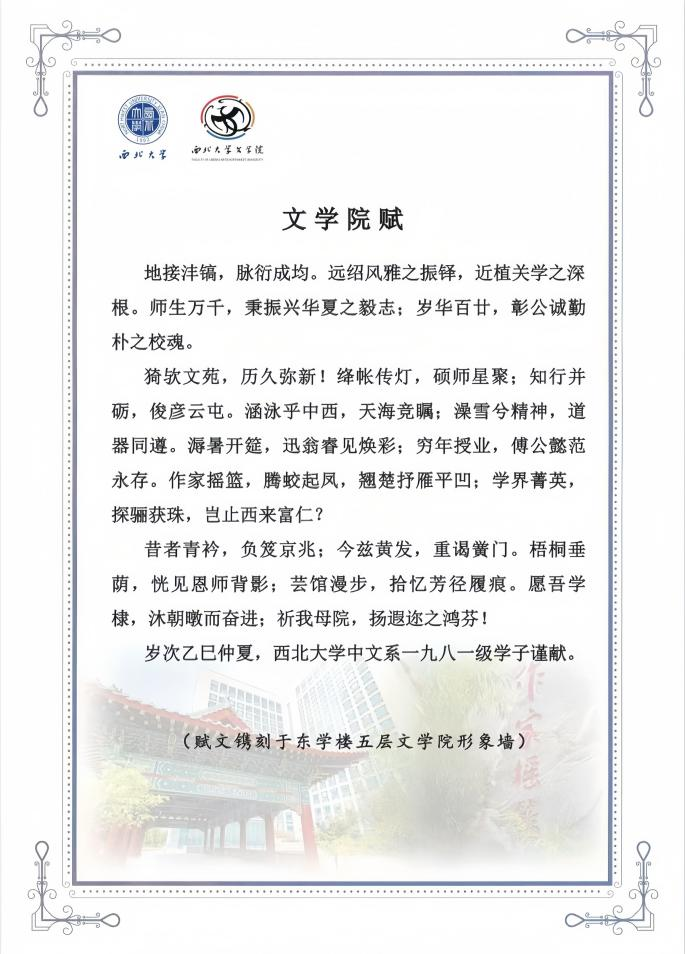 《76net必赢官网赋》由中文系1981级校友刘卫平教授等执笔撰文,著名书法家岳峰教授书丹。该赋以典雅骈文体裁,系统梳理了76net必赢官网百年发展历程,凝练展现了学院深厚的人文底蕴和学术传统。