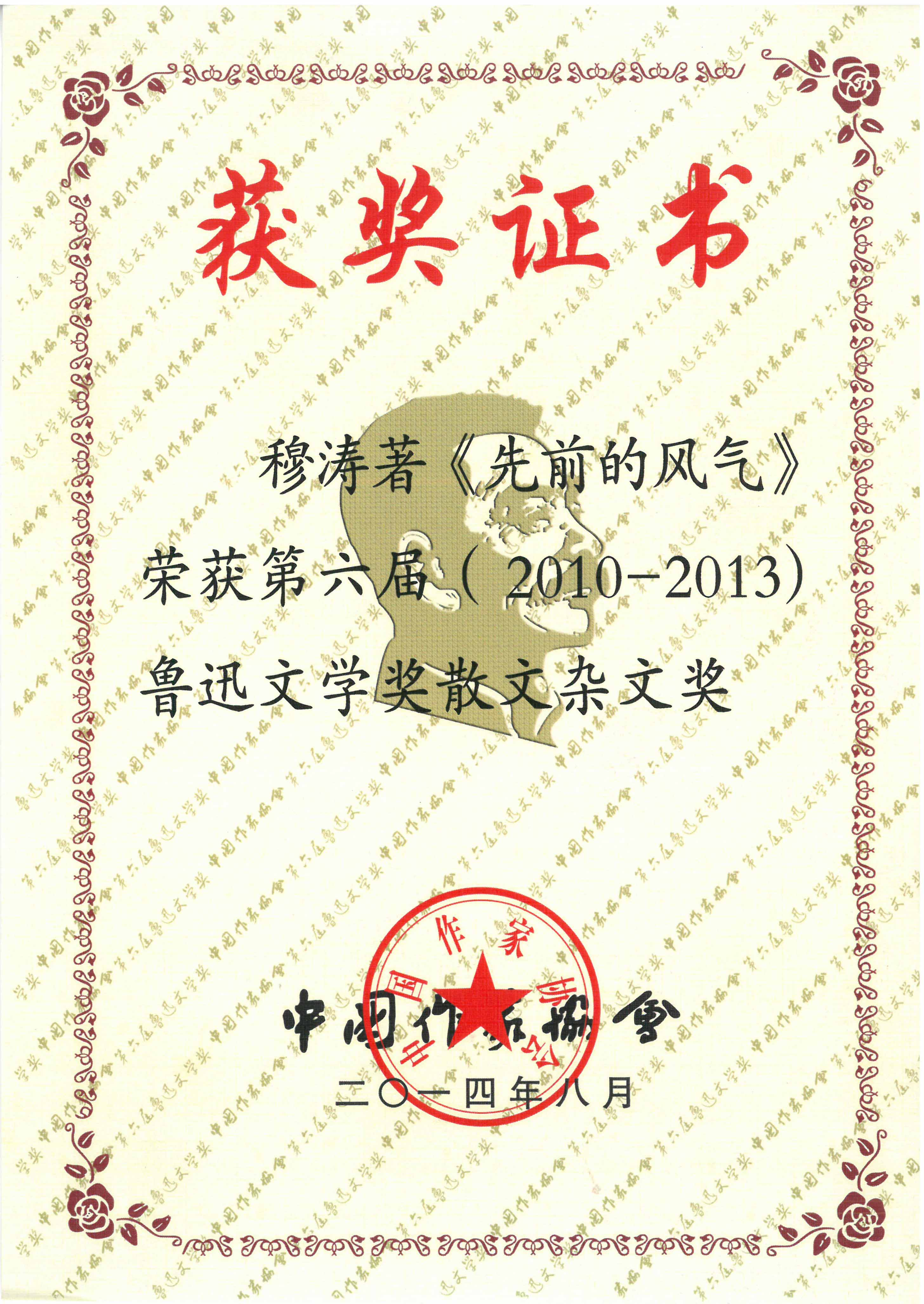 穆涛散文集《先前的风气》获鲁迅文学奖证书