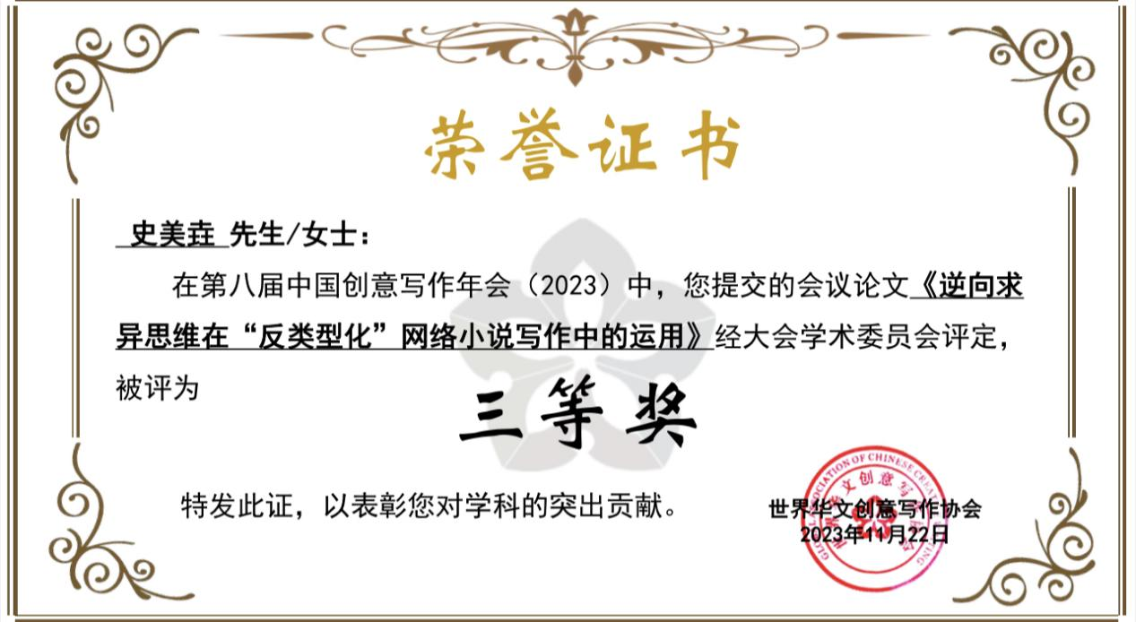 史美垚同学的《逆向求异思维在“反类型化”网络小说写作中的运用》一文,荣获“第八届中国创意写作年会大会论文”三等奖。
