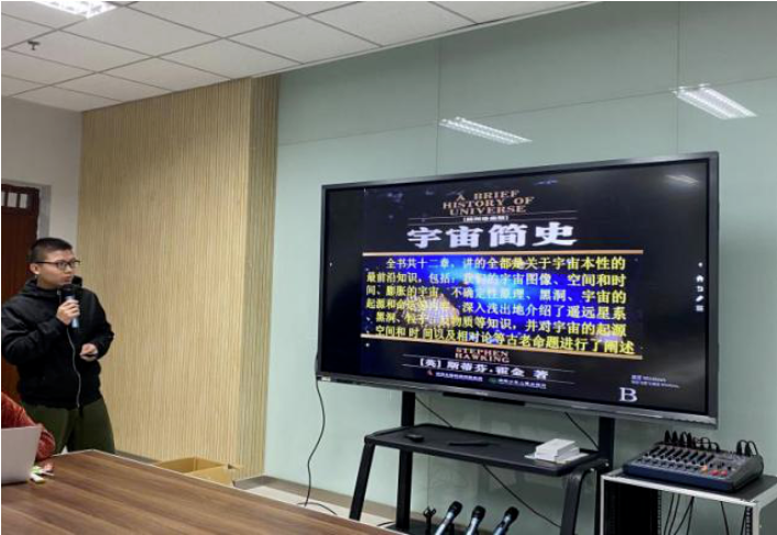 会上,物理学院的张斌超同学向我们分享了霍金的科学贡献与宇宙大爆炸理论,认为未来定将是文学与科学相结合的时代。他指出,宇宙有自己的历史起点,它大约诞生于150亿年前,那时,宇宙只是以一个“点”存在,不占有空间,也没有时间的概念。后来,这个“点”发生了大爆炸,时间和空间由此开始,物质逐渐形成。宇宙起初的温度极高,随着时间的推进,它的空间越来越大,温度越来越低,其中蕴含的能量与物质不断发生复杂的反应,最终形成星系。张斌超同学带给了我们有趣的物理知识,奇妙的思维幻想,以及对文学与物理之间关系的浪漫想象。